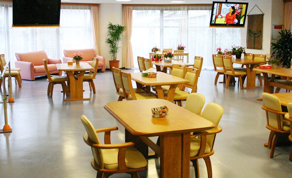 笑歩会天山は天山交差点近くに立地し松山南環状線の側ですがとても静かな場所にあります。 43床全室個室となっています。 1階に食堂があり食事時には、皆さん一緒にわきあいあいとお食事していただいています。浴室は5階で大浴場となっていますが身体の状態に応じて個浴、特浴がありサポートさせていただいています。