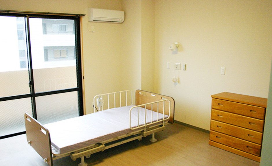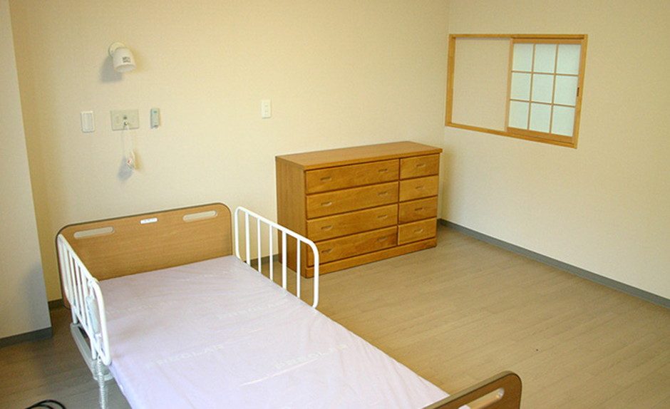 2階・3階・4階が居室となってます。 全室個室で、洗面台とトイレが設置されており、エアコン・チェストが備え付けてあります。 家具や電化製品は、使い慣れたものを自由に持ち込んでいただけます。 ドアや窓は和のテイストで、落ち着いた雰囲気です。 2階居室の入り口は、幅を広くとっており、出入りがしやすくなっています。