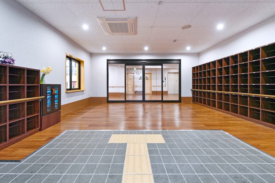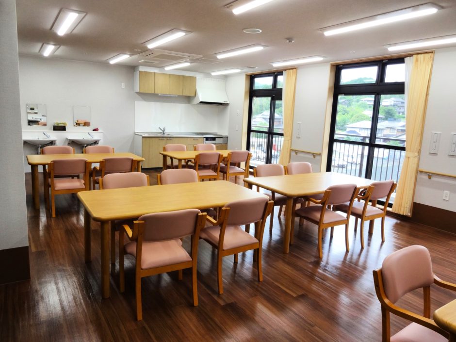 各階共用スペースがあり、食事をするだけではなくお茶を飲みながら談話を楽しまれております。北側廊下も床から天井まで景色が見える仕様となっており、そこで談笑されたり、歩かれている方は景色を見ながら休憩される方もおられます。
