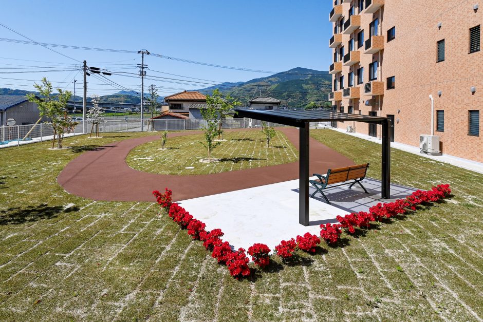 外庭では、気候の良い日は日光浴をされたり、歩かれたり、外庭で家族様の面会をされたりと様々な場面で使用されています。