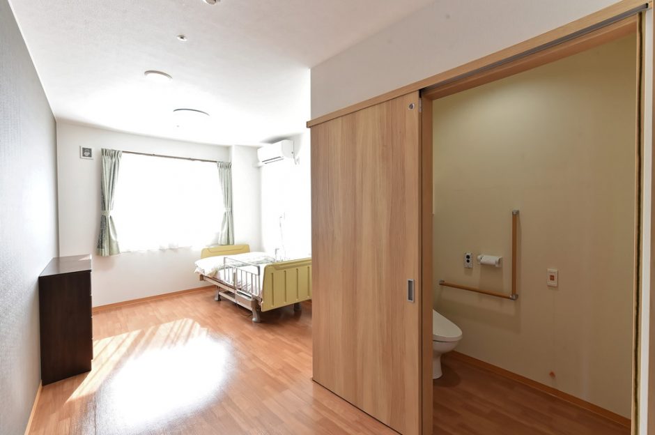 陽の光がたくさん入り、 51部屋全室個室となっています。 入口の格子戸と小窓は和の雰囲気で、すべての居室にトイレ・洗面台・エアコン・タンスが備え付けてあり、ご自身の持ち物も自由に持ち込んでいただけます。介助に充分なスペースと快適な住環境に配慮した安心安全な居室となっています。